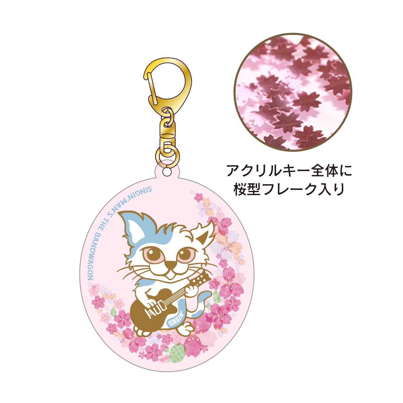 SINGIN'にゃんがプリントされている桜キーホルダー。